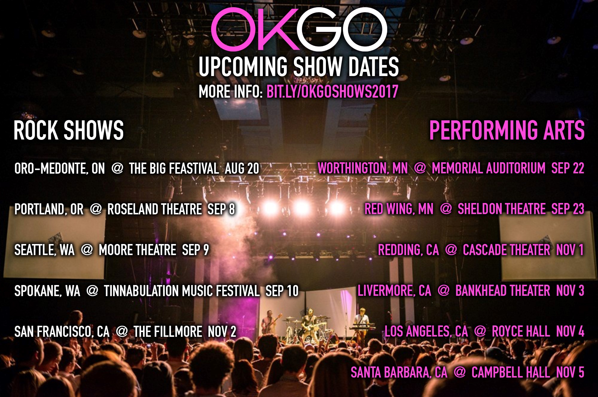 One thing we don’t do is break promises, so here are new Fall dates. Note that the performance arts shows will be the band live scoring their videos. These shows will be family-friendly and can’t miss as the band has never previously done this before. What could go wrong? You not being there.